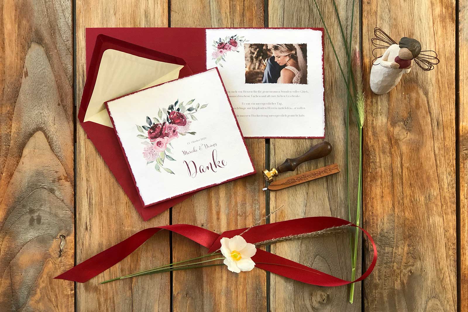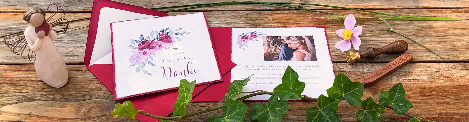 Damit euer Hochzeitstag unvergessen bleibt, versendet ihr einige Wochen nach dem großen Fest wunderschöne Danksagungen zur Hochzeit. Schön ist es, eine kleine Auswahl eurer schönsten Hochzeitsfotos einzufügen und euch damit bei euren Gästen für das Erscheinen und die liebevollen Aufmerksamkeiten zu bedanken. Mit den Danksagungskarten gebt Ihr außerdem ein schönes Erinnerungsstück an die Hochzeitsfeier an eure Gäste zurück.