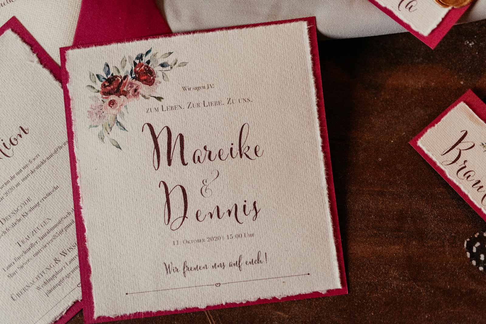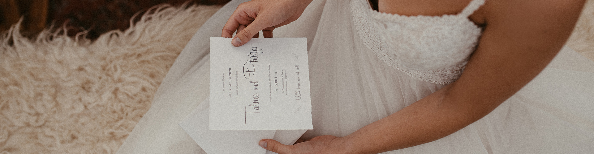Eure Hochzeit wird umso harmonischer, je detaillierter ihr einzelne Elemente aufeinander abstimmt. Das kann etwa euer Hochzeitsthema, das Brautkleid und die Dekoration sein. Aber auch eure Papeterie verstärkt einen solchen Wiedererkennungswert auf dezente Weise.